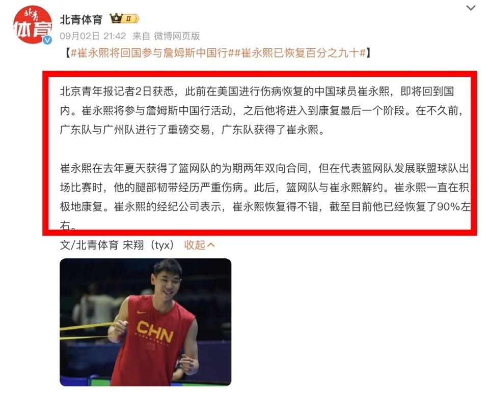 而让这场指导课更具看点的,是另一位中国篮球新星的加入。根据北青体育媒体人宋翔及“球圈赵探长”等多方消息确认,此前一直在美国进行伤病康复的崔永熙,已经正式回到国内,并且他回国后的首站活动,便是参与詹姆斯的这次中国行,但是没有公布具体的细节,结合詹姆斯的行程,大概率汇合地点是在成都。据悉,崔永熙落地后的第一件事就是观看了九三阅兵,而接下来他将有很大可能会出现在成都的活动现场,与詹姆斯碰面。一位是功成名就的篮坛传奇,一位是前途无量的中国男篮希望之星,在结束这次活动后,崔永熙将进入康复的最后一个阶段,为加盟新东家广东宏远做准备,相信广东球迷开始期待了!